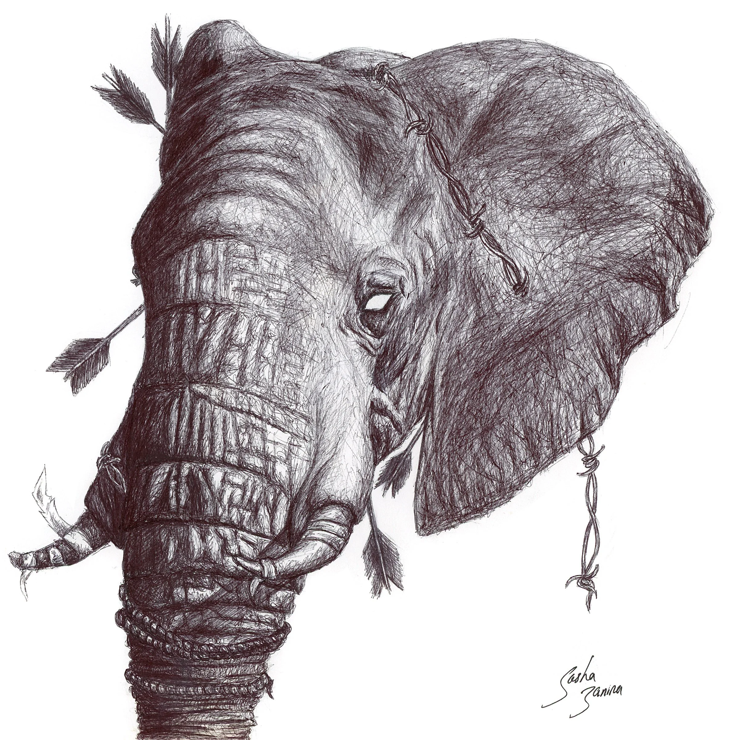 Illustration of an elephant’s head entangled in rope and arrows, created with a sketching technique.